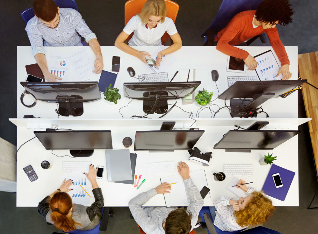 RW7C5Y Diverse young team working at coworking place, top view