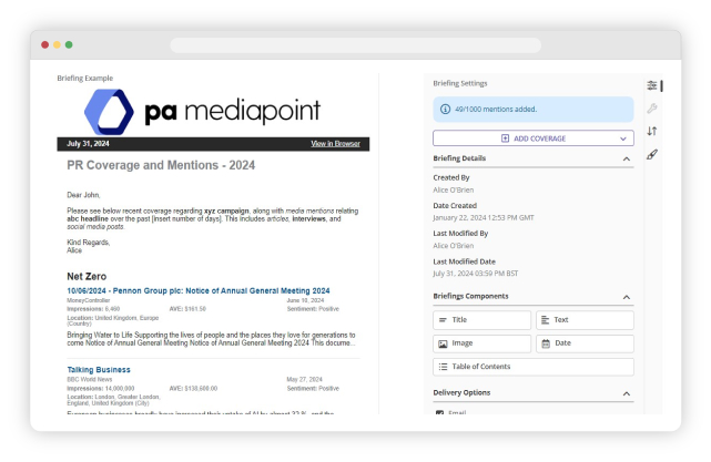 Set up automatic briefings to include all the coverage pulled in by a topic or topics, sent to pre-determined lists.